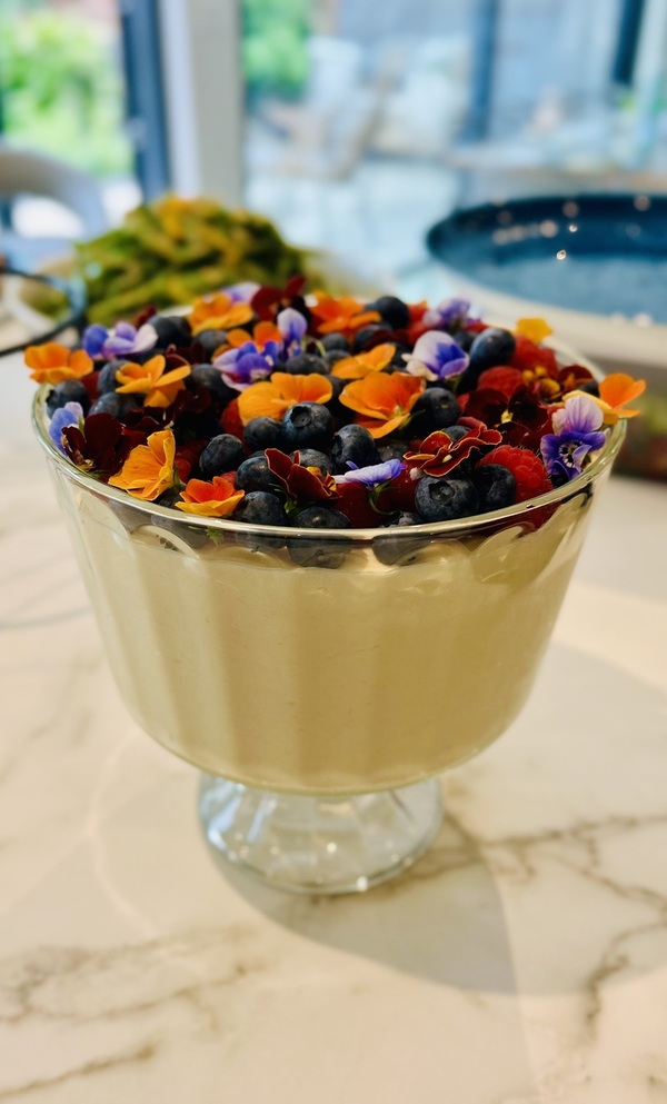 - Lemon & Passionfruit Posset, Raspberries & Flowers